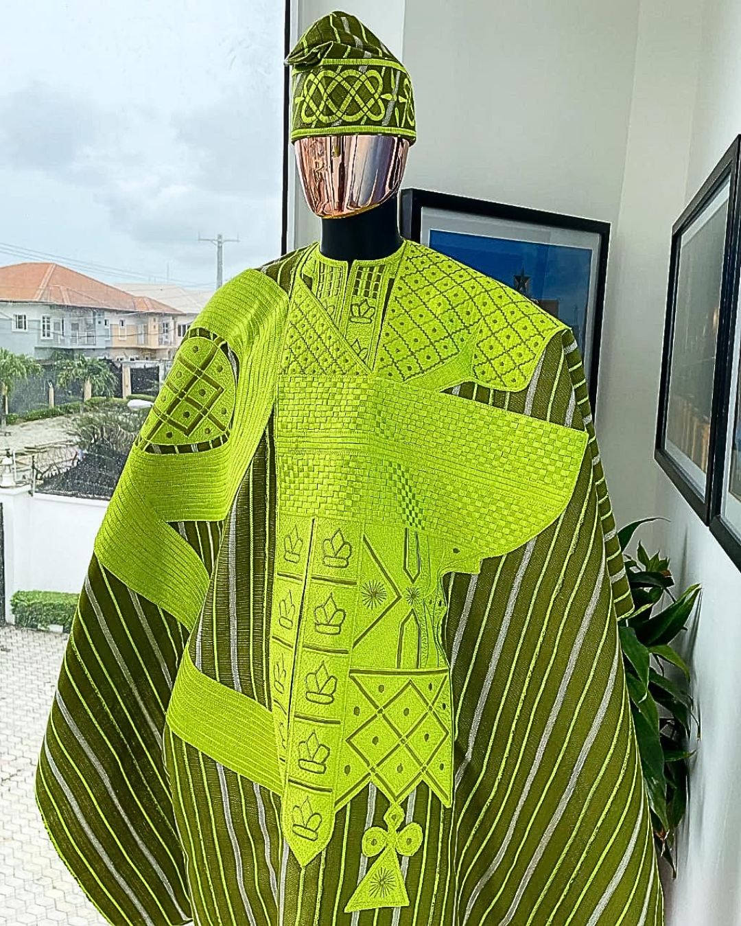 A stripe lemon green and olive green, aso oke regal agbada, dashiki, Sokoto, matching hand-woven Yoruba hat