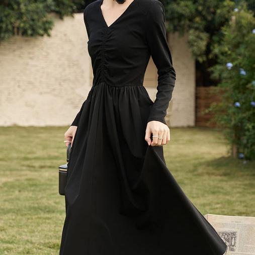 Step into the new season with grace and elegance in this stunning black knitted smocked dress. Perfect for both spring and autumn, this dress is designed to make you feel effortlessly stylish and comfortable. Its vintage-inspired A-line silhouette and V-neckline add a touch of classic charm, while the modern design elements ensure you stay on-trend.