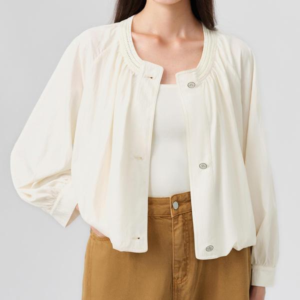 - O-neck collar and single-breasted closure for a classic look