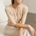 Our V-neck knitted cardigan stands out with its refined simplicity and elegant design. The single-breasted style adds a classic touch, while the slim fit enhances your silhouette, offering a flattering look. The half sleeves provide a unique twist, perfect for those in-between seasons when you need just a bit of extra coverage.