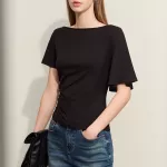 The standout feature of this T-shirt is its unique asymmetric slash neck, which adds a modern twist to a classic silhouette. The shirring detail further enhances its elegance, making it a distinctive piece that sets you apart from the crowd. Additionally, the blend of cotton, modal, and spandex ensures that the top is not only stylish but also incredibly comfortable and breathable.