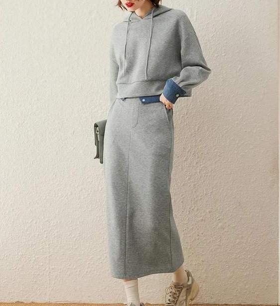 - Casual Style: Combines casual elegance with a hooded sweatshirt and a mid-calf length skirt.
